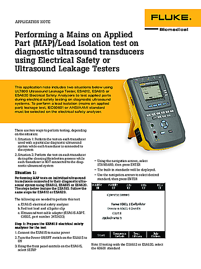 This application note includes two situations below using ULT800 Ultrasound Leakage Tester, ESA612, ESA615 or ESA620 Electrical Safety Analyzers to test applied parts during electrical safety testing on diagnostic ultrasound systems. To perform a lead isolation (mains on applied part) leakage test, IEC60601 or ANSI/AAMI standard must be selected on the electrical safety analyzer.