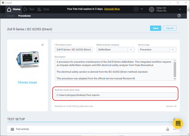 This tutorial will walk through the process for configuring Fluke Biomedical OneQA to automatically generate readable PDF reports and detailed JSON files whenever you or your team executes a test procedure.